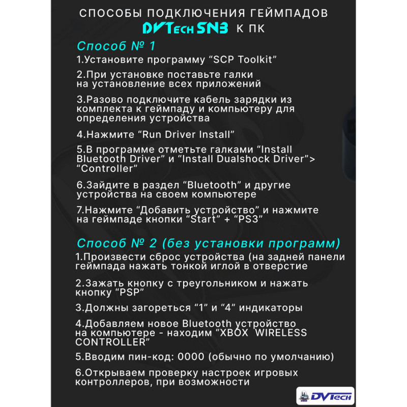 Игровой геймпад поддерживает беспроводное соединение по Bluetooth версии 4.0 и проводное при помощи USB-кабеля. Встроенный аккумулятор ёмкостью 610 mAh позволяет играть до нескольких часов без подзарядки, а при необходимости геймпад можно подключить к консоли с помощью USB-кабеля и продолжить игру, пока он заряжается. Беспроводной игровой геймпад DVTech совместим с PS3, ПК на Windows и iOS, с планшетами и смартфонами iOS и другими устройствами, поддерживающими Bluetooth. Наличие функций гироскопа и акселерометра, которые позволяют определять положение и направление движения геймпада в воздухе. Это позволяет более точно управлять персонажами или игровыми элементами, особенно в играх, требующих динамичного управления.