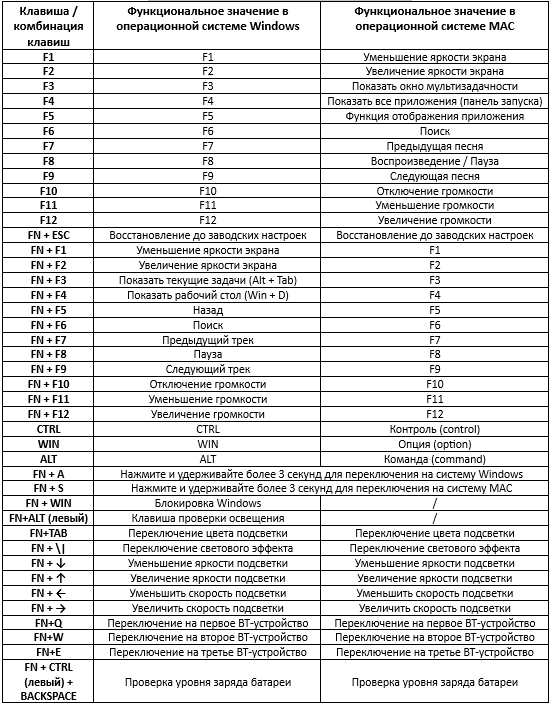 Функции кнопок и горячих клавиш (сочетаний кнопок) в механической игровой клавиатуре RAGNOK RK104