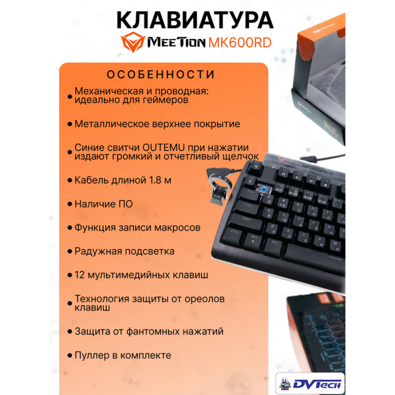 MeeTion MK600RD — это механическая игровая клавиатура с радужной подсветкой и форм-фактором, вдохновлённым игровым процессом. Клавиатура оснащена синим переключателем OUTEMU, звук которых чёткий, а обратная связь хорошая. Эргономичный дизайн отвечает требованиям геймеров к тактильным ощущениям и производительности, значительно повышает эффективность работы и использует цельнометаллическую панель для более длительного срока службы. Независимо от того, являетесь ли вы геймером или офисным работником, эта клавиатура отлично подойдёт для ваших повседневных задач. Вы можете переключаться между различными режимами подсветки по своему усмотрению. Клавиатура Meetion оснащена удобными функциями, такими как настраиваемая светодиодная подсветка, защита от фантомных нажатий, 12 мультимедийных клавиш, запись макросов. Функция анти-гостинг нажатий для всех клавиш обеспечивает более быструю и точную работу во время игры, не беспокоясь о конфликтах клавиш в игре. Независимо от того, участвуете ли вы в соревнованиях или играете с друзьями, концентрация необходима. Механическая клавиатура Meetion подключается по стандартному USB-кабелю длиной 1.8 м.
